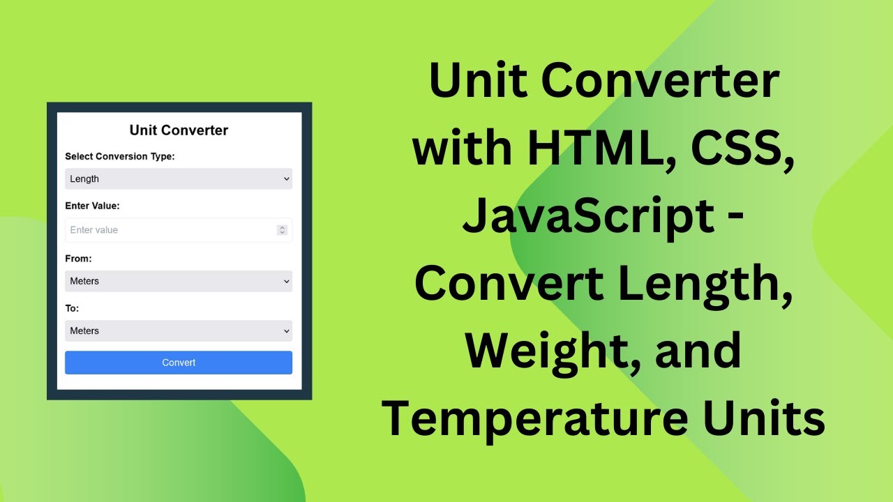 Unit conversion is an essential tool in many applications, from scientific calculations to everyday measurements. In this tutorial, we’ll create a Unit Converter using HTML, CSS, and JavaScript that allows users to convert between different units of length, weight, and temperature. By the end of this guide, you’ll have a fully functional unit conversion tool that you can integrate into your projects. 🚀