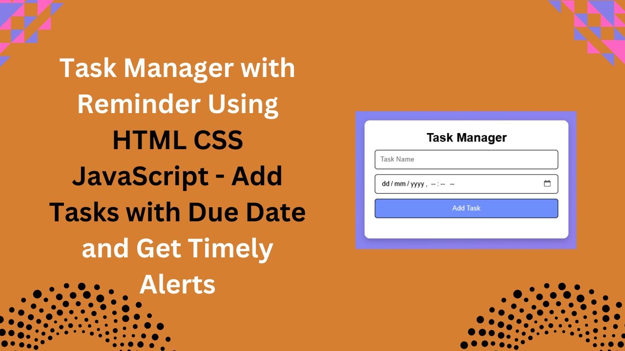 Managing tasks efficiently is crucial for productivity. In this tutorial, we’ll create a Task Manager with Reminder using HTML, CSS, and JavaScript. This simple yet effective project will allow users to add tasks with due dates, display them in a list, and receive automatic alerts when a task is due. Whether you’re a beginner or looking for a small JavaScript project, this tutorial is perfect for learning DOM manipulation, event handling, and date/time management.