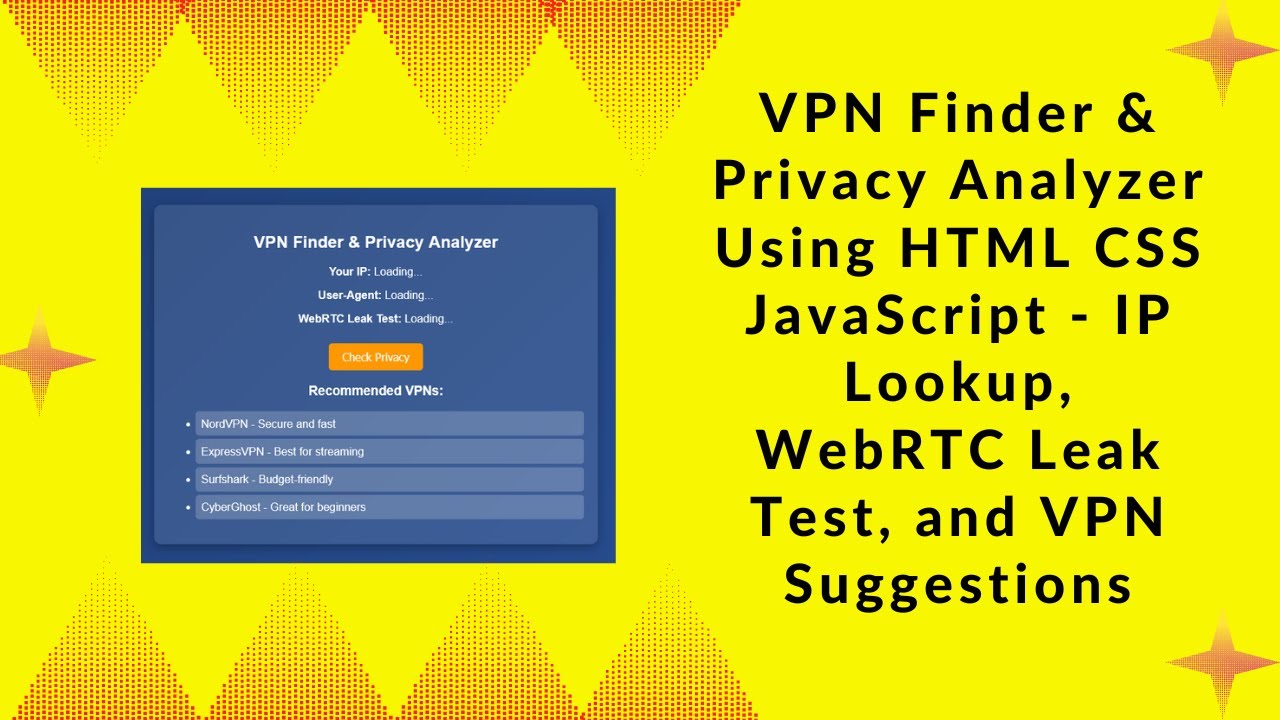 In today’s digital world, online privacy and security have become crucial. Many internet users are concerned about their personal data being exposed to cyber threats. To help you stay safe, weβve created a VPN Finder & Privacy Analyzer using HTML, CSS, and JavaScript. This tool helps users check their public IP address, browser details, and WebRTC leak status, ensuring their online privacy.